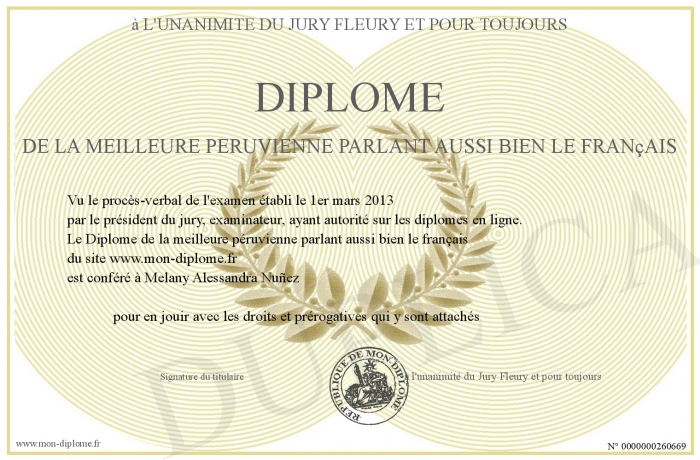 Envoyez par email votre Diplôme de la meilleure péruvienne parlant aussi bien le français personalisé