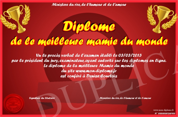 Envoyez par email votre Diplôme de le meilleure mamie du monde personalisé