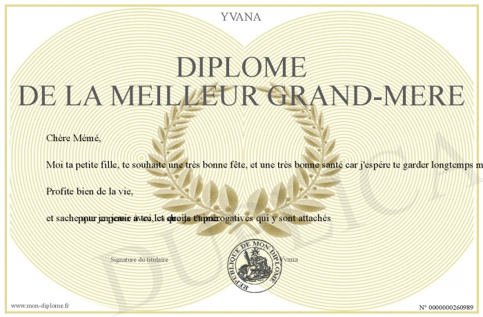 Envoyez par email votre Diplôme de la meilleur grand-mère personalisé