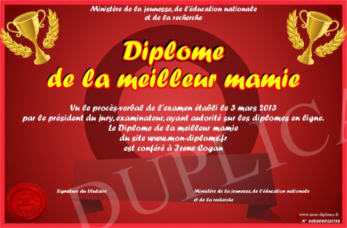 Envoyez par email votre Diplôme de la meilleur mamie personalisé