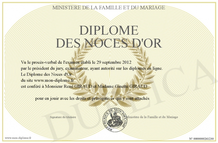Envoyez par email votre Diplôme des Noces d'Or personalisé