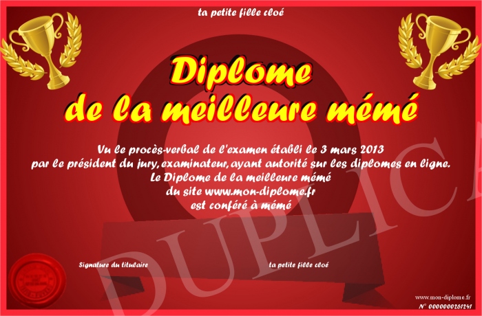 Envoyez par email votre Diplôme de la meilleure mémé personalisé