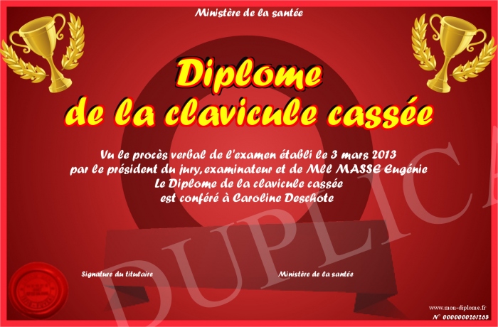 Envoyez par email votre Diplôme de la clavicule cassée personalisé