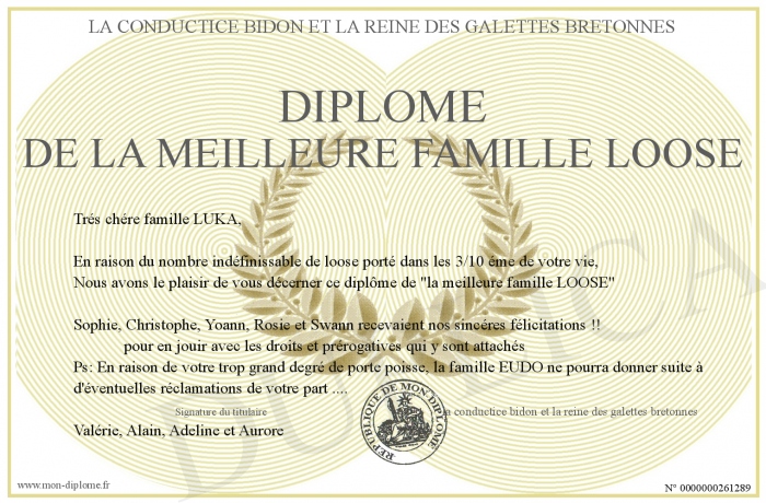 Envoyez par email votre Diplôme de la meilleure famille loose personalisé