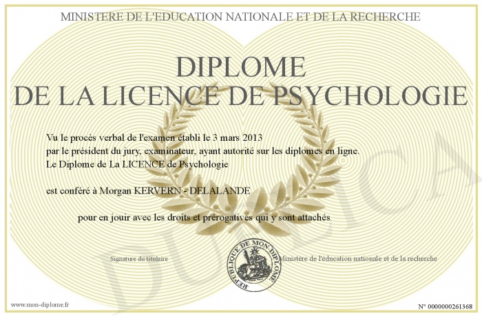 Envoyez par email votre Diplôme de La LICENCE de Psychologie personalisé