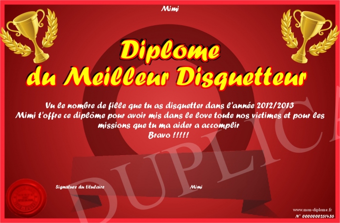 Envoyez par email votre Diplôme du Meilleur Disquetteur personalisé