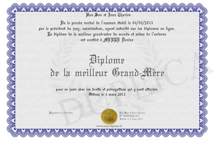 Envoyez par email votre Diplôme de la meilleur Grand-Mère personalisé