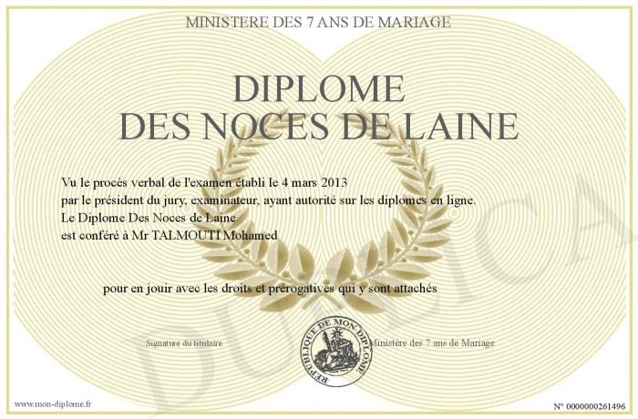 Envoyez par email votre Diplôme Des Noces de Laine personalisé