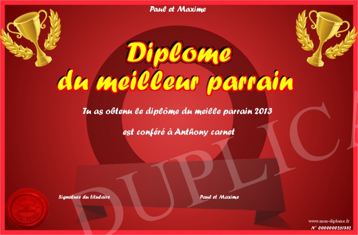 Envoyez par email votre Diplôme du meilleur parrain personalisé