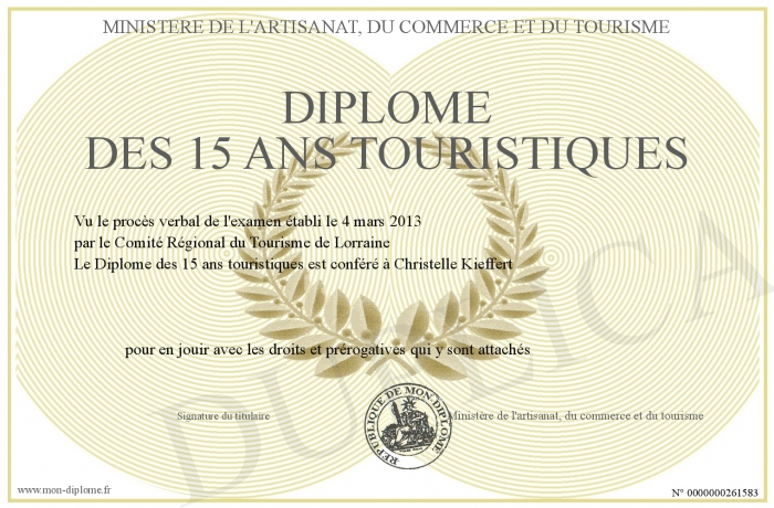 Envoyez par email votre Diplôme des 15 ans touristiques personalisé
