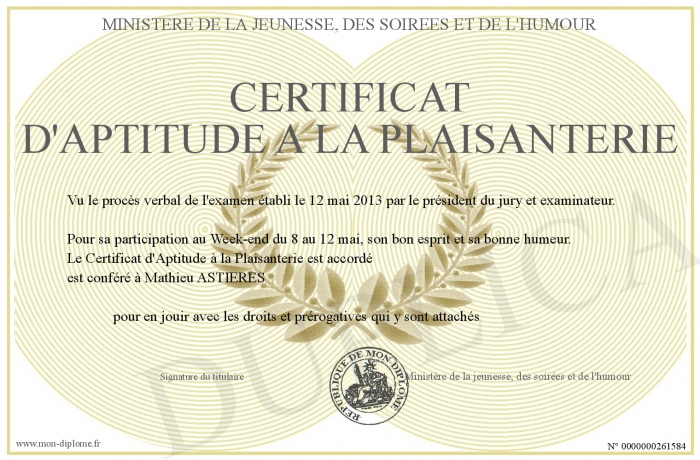 Envoyez par email votre Certificat d'Aptitude a la Plaisanterie personalisé