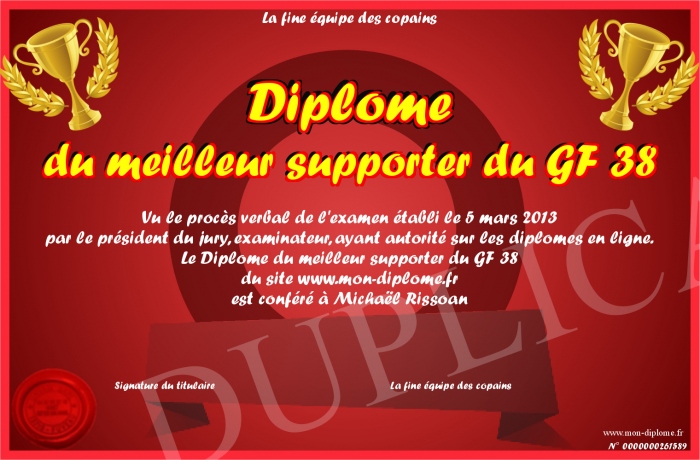 Envoyez par email votre Diplôme du meilleur supporter du GF 38 personalisé