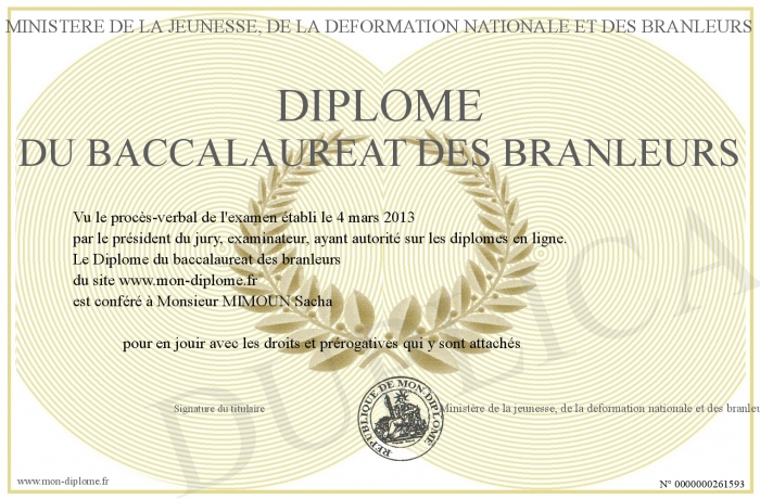 Envoyez par email votre Diplôme du baccalaureat des branleurs personalisé