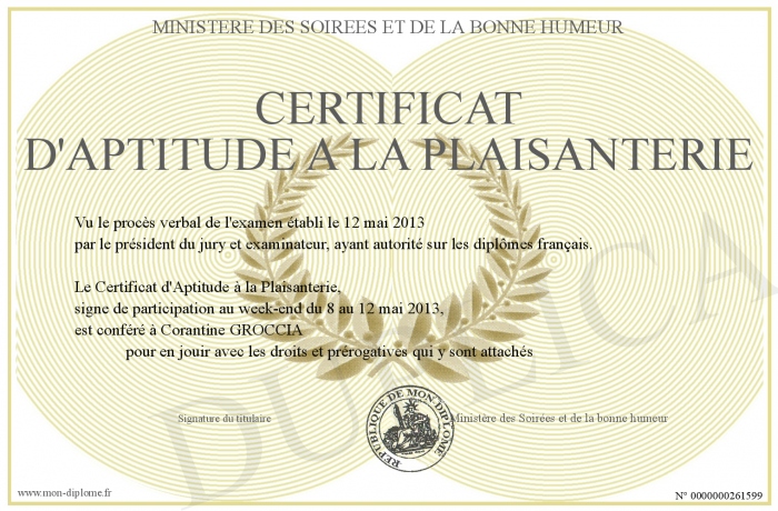 Envoyez par email votre Certificat d'aptitude a la plaisanterie personalisé