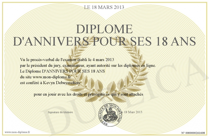 Envoyez par email votre Diplôme D'ANNIVERS POUR SES 18 ANS personalisé