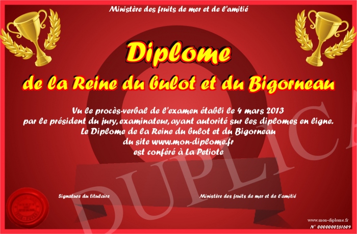 Envoyez par email votre Diplôme de la Reine du bulot et du Bigorneau personalisé