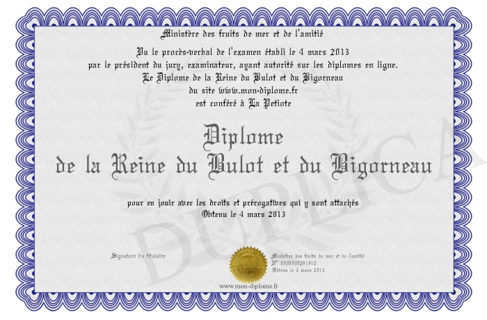 Envoyez par email votre Diplôme de la Reine du Bulot et du Bigorneau personalisé
