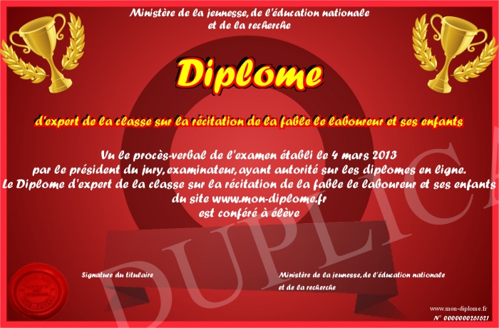 Envoyez par email votre Diplôme d'expert de la classe sur la récitation de la fable le laboureur et ses enfants personalisé