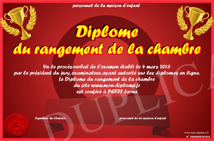 Envoyez par email votre Diplôme du rangement de la chambre personalisé