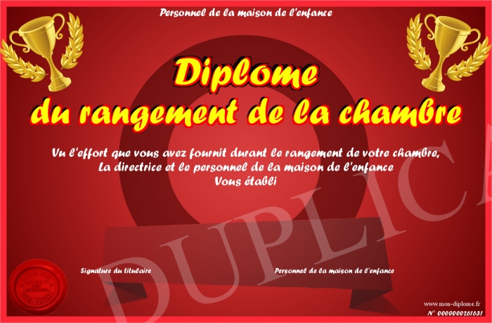 Envoyez par email votre Diplôme du rangement de la chambre personalisé