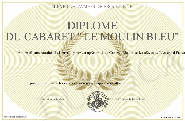 Envoyez par email votre Diplôme du Cabaret - Le Moulin Bleu- personalisé