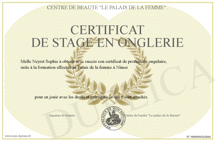 Envoyez par email votre Certificat de stage en onglerie personalisé