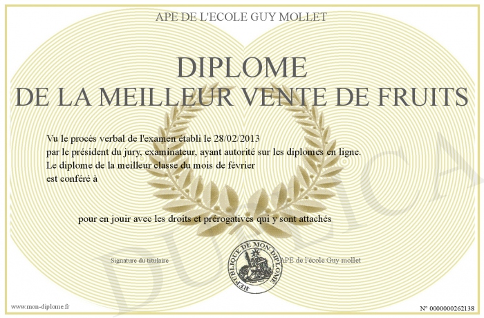 Envoyez par email votre Diplôme de la meilleur vente de fruits personalisé