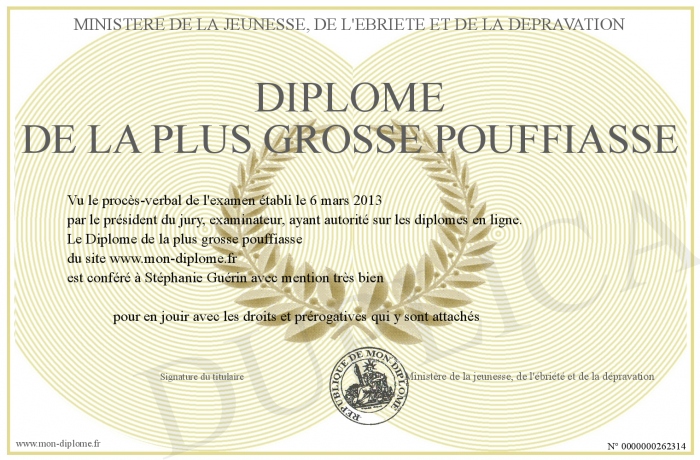 Envoyez par email votre Diplôme de la plus grosse pouffiasse personalisé