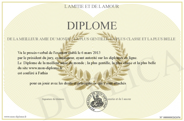 Envoyez par email votre Diplôme de la meilleur amie du monde ; la plus gentille, la plus classe et la plus belle personalisé