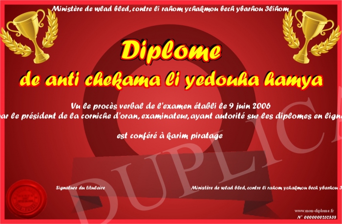 Envoyez par email votre Diplôme de anti chekama li yedouha hamya personalisé