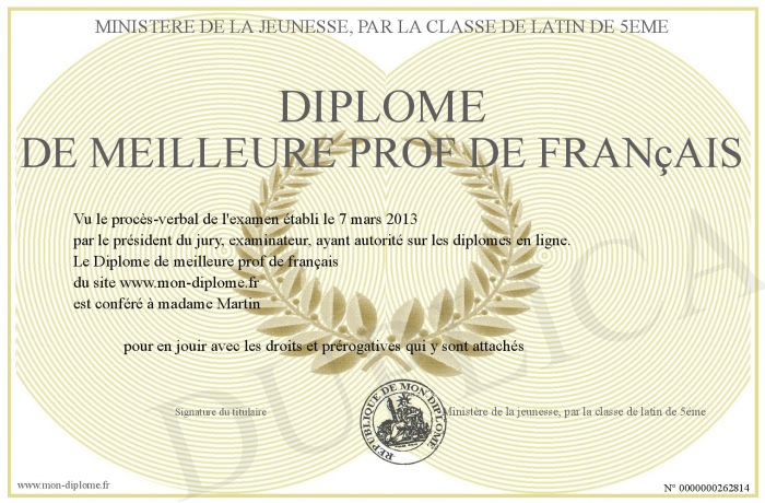 Envoyez par email votre Diplôme de meilleure prof de français personalisé