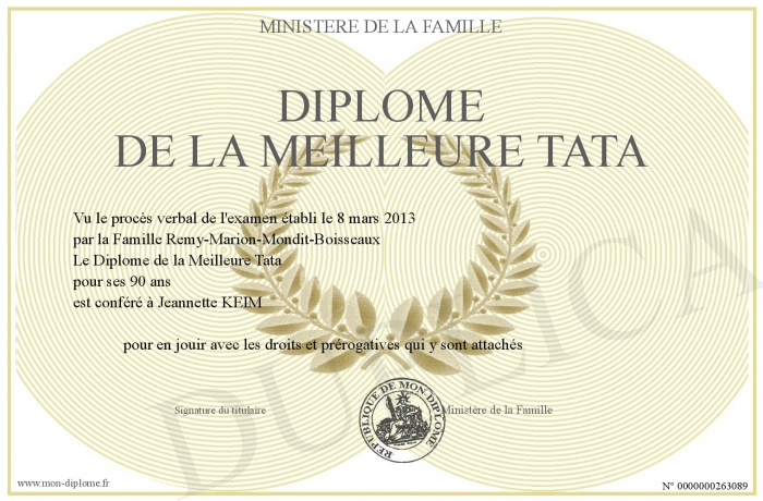 Envoyez par email votre Diplôme de la Meilleure Tata personalisé