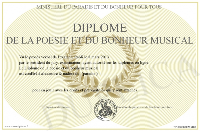 Envoyez par email votre Diplôme de la poésie et du bonheur musical personalisé