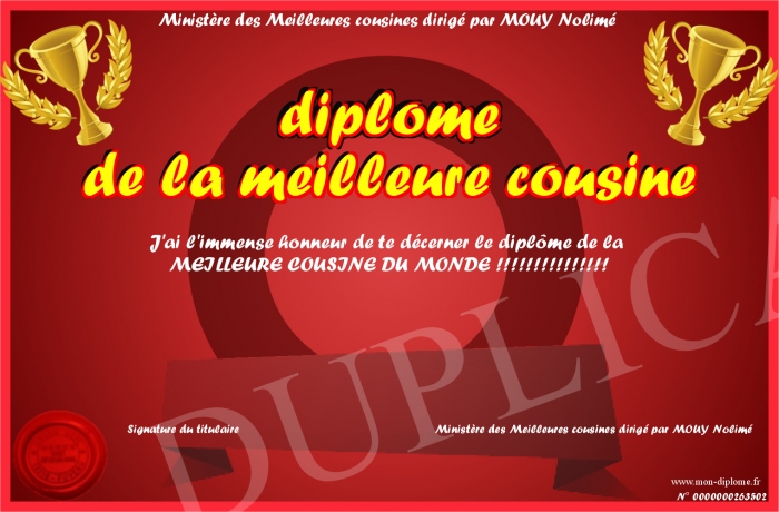 Envoyez par email votre diplome de la meilleure cousine personalisé