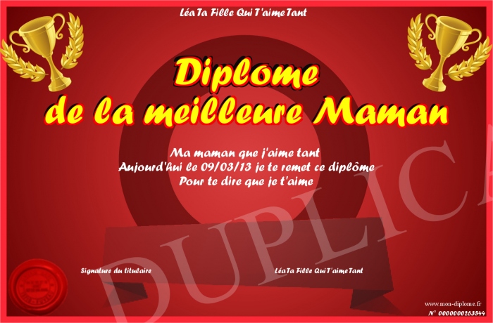 Envoyez par email votre Diplome de la meilleure Maman personalisé