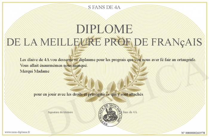 Envoyez par email votre Diplôme de la meilleure prof de français personalisé