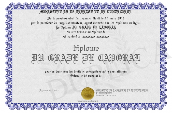 Envoyez par email votre diplome DU GRADE DE CAPORAL personalisé