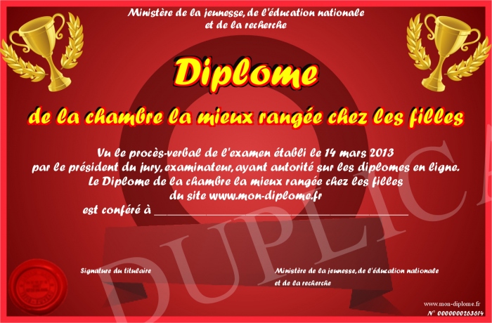 Envoyez par email votre Diplôme de la chambre la mieux rangée chez les filles personalisé