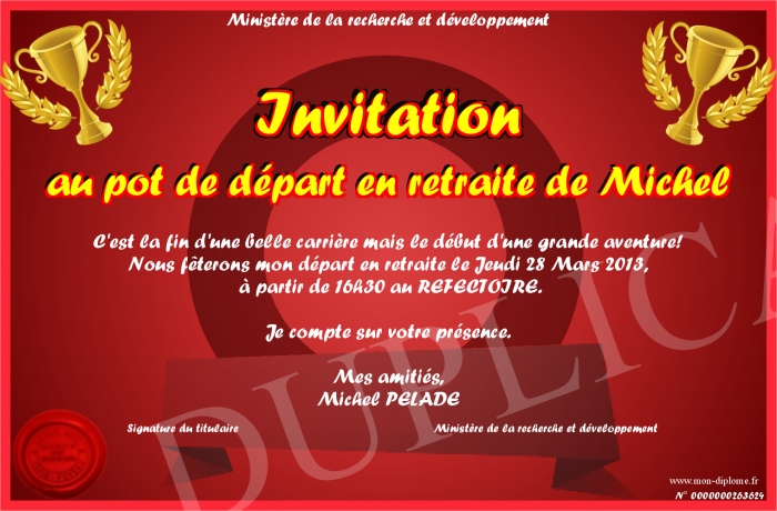 Envoyez par email votre Invitation au pot de départ en retraite de Michel personalisé