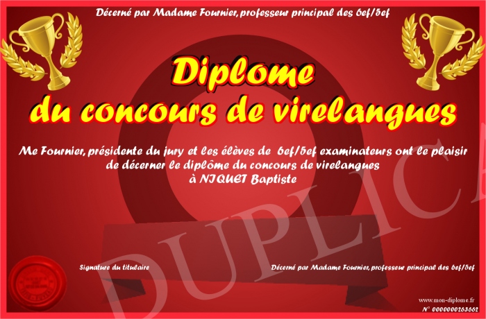 Envoyez par email votre Diplôme du concours de virelangues personalisé