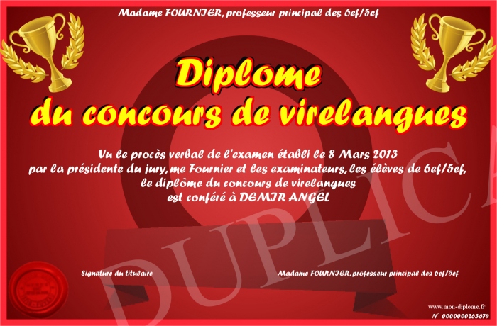 Envoyez par email votre Diplôme du concours de virelangues personalisé