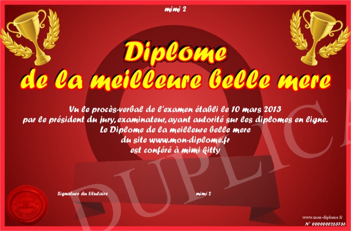 Envoyez par email votre Diplôme de la meilleure belle mere personalisé