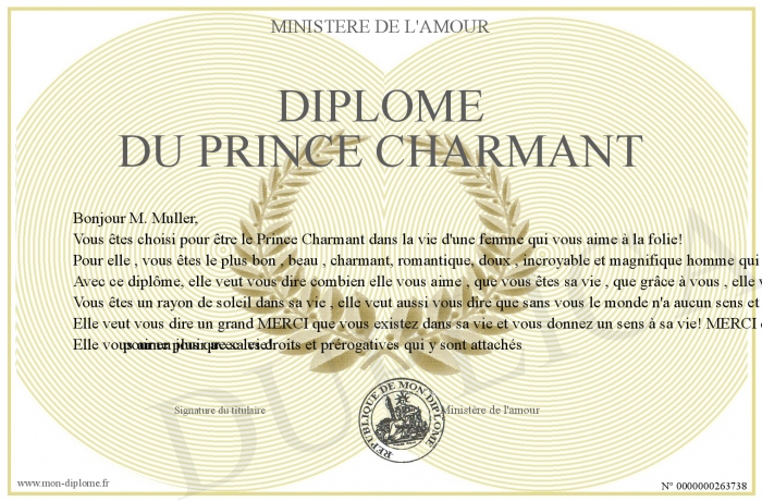 Envoyez par email votre Diplôme du Prince Charmant personalisé