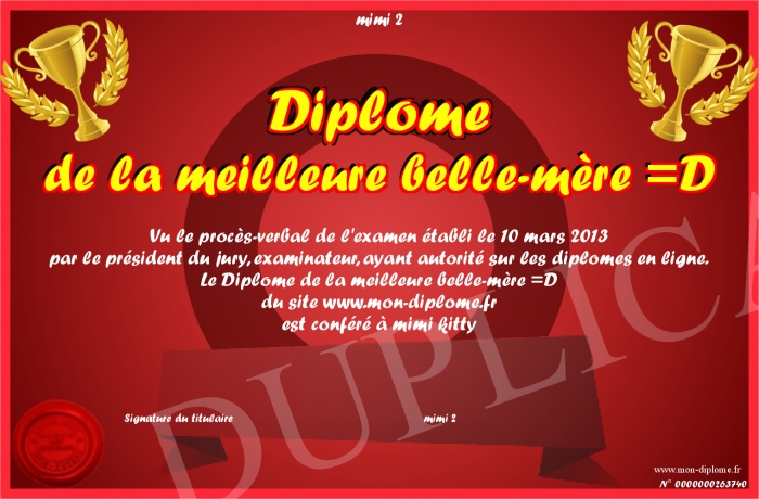 Envoyez par email votre Diplôme de la meilleure belle-mère =D personalisé