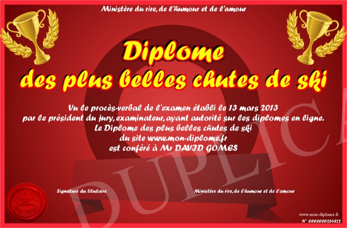 Envoyez par email votre Diplome des plus belles chutes de ski personalisé