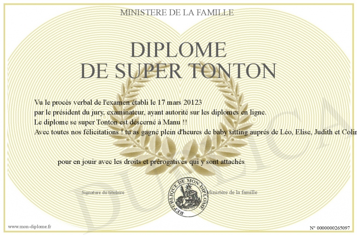 Envoyez par email votre Diplôme de super Tonton personalisé
