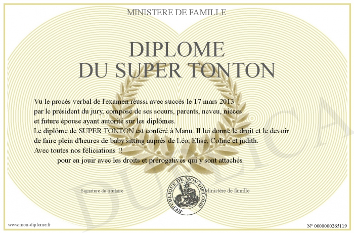 Envoyez par email votre Diplôme du SUPER TONTON personalisé