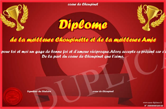 Envoyez par email votre Diplome de la meilleure Choupinette et de la meilleure Amie personalisé