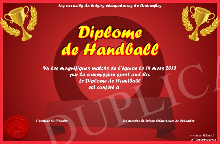 Envoyez par email votre Diplôme de Handball personalisé
