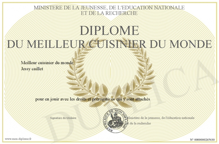 Envoyez par email votre diplome du meilleur cuisinier du monde personalisé